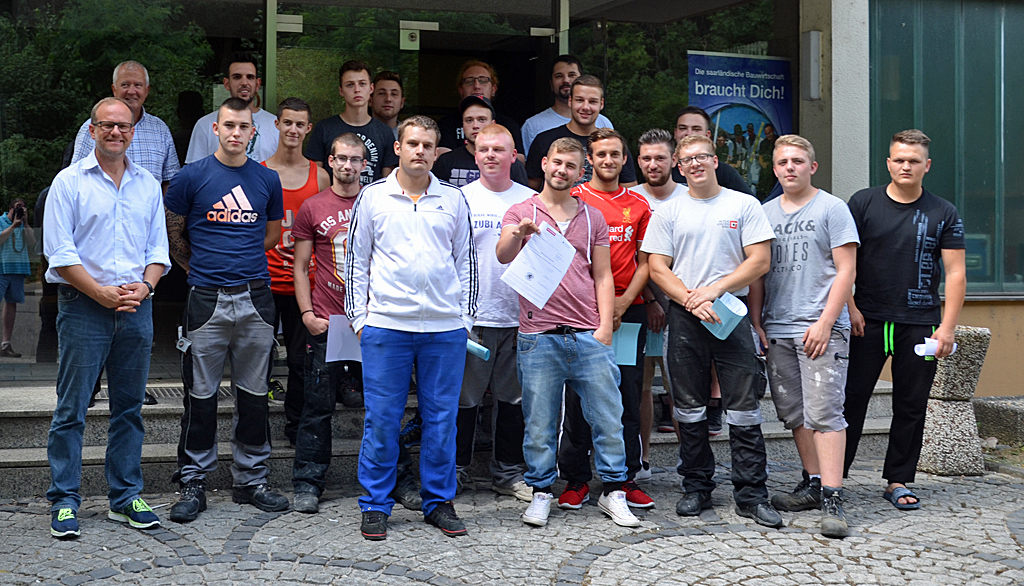 12 Auszubildende zum Hochbaufacharbeiter Betonbau haben heute im Ausbildungszentrum ihre Prüfung bestanden. Mit einer kleinen Feier wurden die neuen Facharbeiter von den Mitgliedern des Prüfungsausschusses, ihrem Ausbilder Mario Dühr und dem Leiter des Ausbildungszentrums, Herrn Markus Pirron, verabschiedet. Für gute Leistungen erhielt Heiko Voltz einen Weiterbildungsgutscheine in Höhe von 50,00 €. Bester wurde Pascal Moos. Dafür erhielt er einen Weiterbildungsgutschein in Höhe von 100,00 € der ihm vom Leiter des Ausbildungszentrums Markus Pirron überreicht wurde.