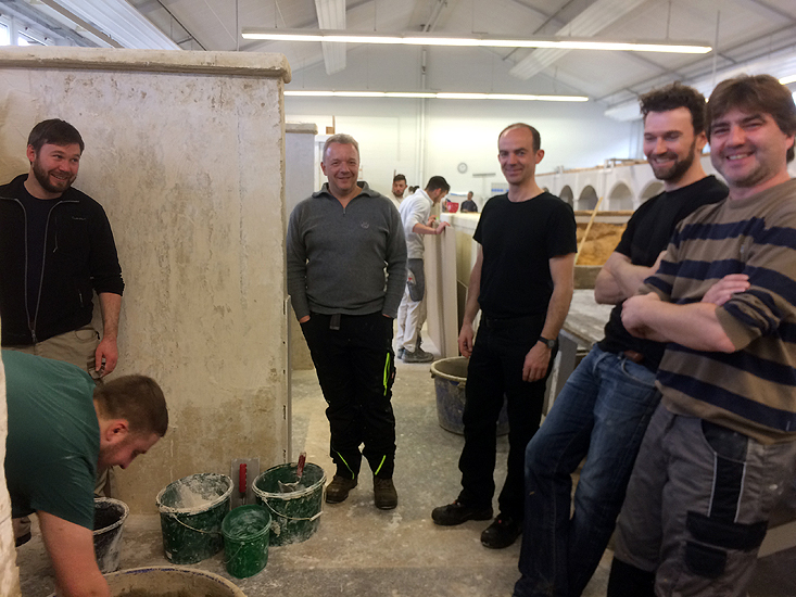 Die Lehrer der Stuckateurklassen des TGSBBZ Saarlouis Jürgen Raber, (Abteilungsleiter), Oliver Schorr, Christian Zewe, Michael Kirchner und Thorsten Herrmann besuchten die Stuckateurwerkstatt des Ausbildungszentrums, um ihre Kenntnisse aufzufrischen und um diese Kenntnisse durch neu erworbene Fertigkeiten zu vertiefen.