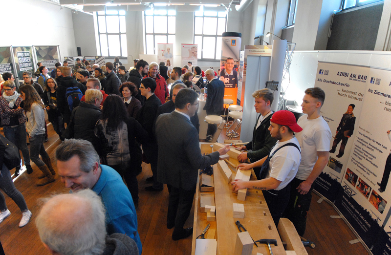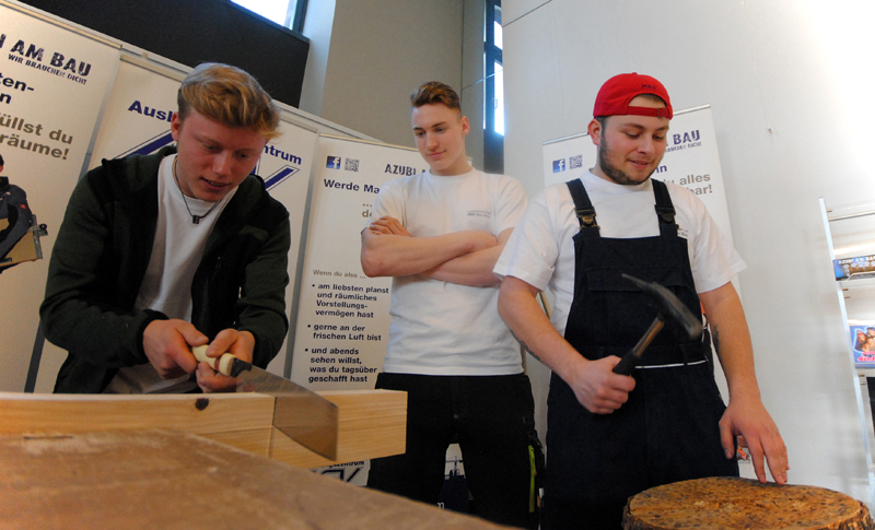 Durch das Ausbildungszentrum wurden die Berufe: Maurer, Stahlbetonbauer, Tief und Straßenbauer, Zimmerer, Dachdecker, Stuckateur, sowie Fliesen, Platten und Mosaikleger den interessierten Messebesuchern näher gebracht.