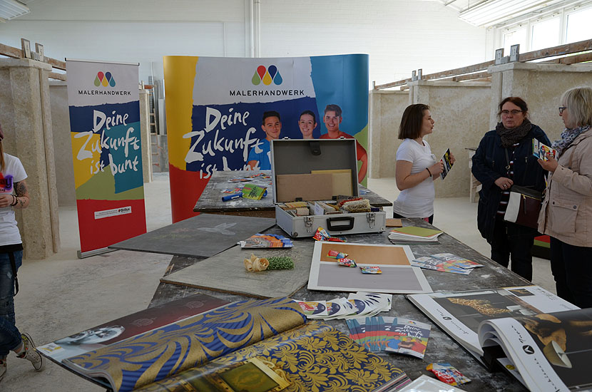 48 Besucherinnen kamen zum Ausbildungszentrum. Die Mädchen konnten sich im ABZ je nach Interesse die verschiedenen Werkstätten anschauen. Es ist ein großer Vorteil des ABZ – dass man in mehrere Berufe gleichzeitig reinschnuppern kann. In den einzelnen Werkbereichen ist die praktische Tätigkeit an Werkstücken jederzeit möglich und erwünscht. Ebenso ist gewünscht, dass die Auszubildenden, die zurzeit selbst in Ausbildung stehen und Ausbilder zu den Ausbildungsberufen befragt werden. Daneben wurden in allen Bereichen zusätzliche Aktionen für die Mädchen angeboten. Der Tag im ABZ soll das Handwerk greifbar machen und so konnten die Mädchen z. B. in den Berufen Stuckateur, Maurer, Betonbauer, Fliesen- u. Plattenleger oder Zimmerer gleich selbst Hand anlegen. In diesem Jahr präsentierte sich die Maler- u. Lackiererinnung des Saarlandes auch mit einem Stand im Ausbildungszentrum und erweitere so das Angebot für die Mädchen.