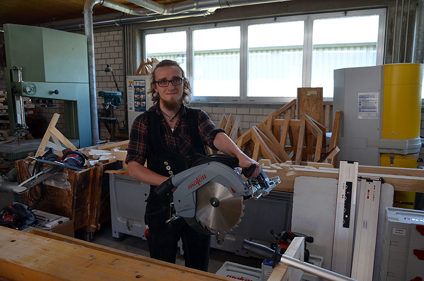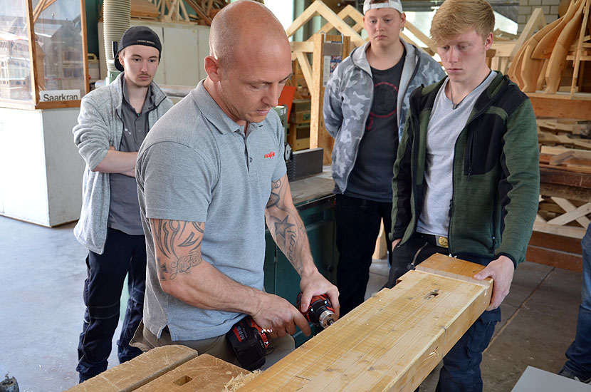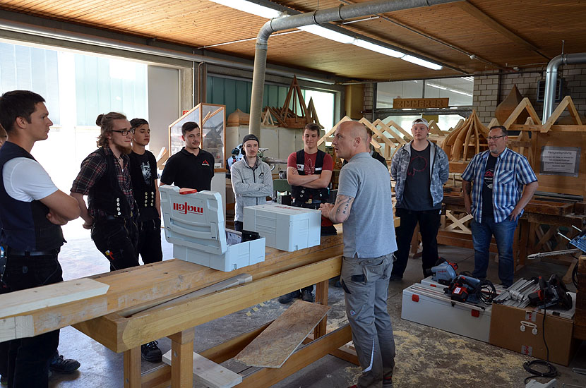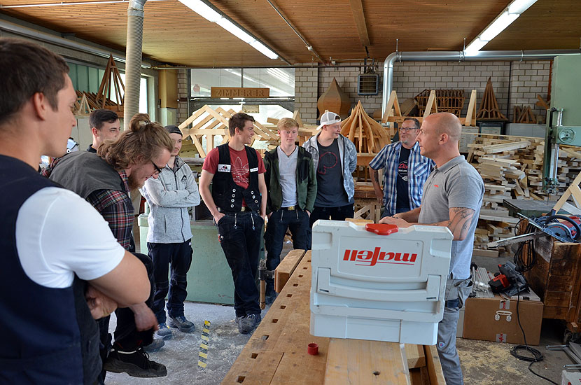 Der Fachberater Mario Maßem der Firma Mafell und Marco Kürten der Firma Hees + Peters (als Vertriebspartner der Firma Mafell) stellten den Auszubildenden des Zimmererhandwerks das neue Maschinenprogramm der Firma Mafell vor .
