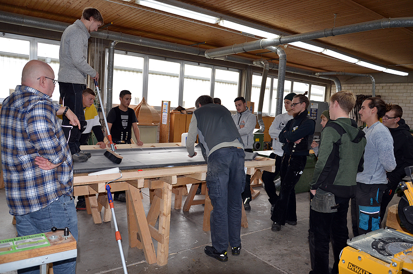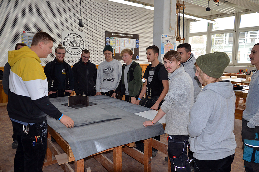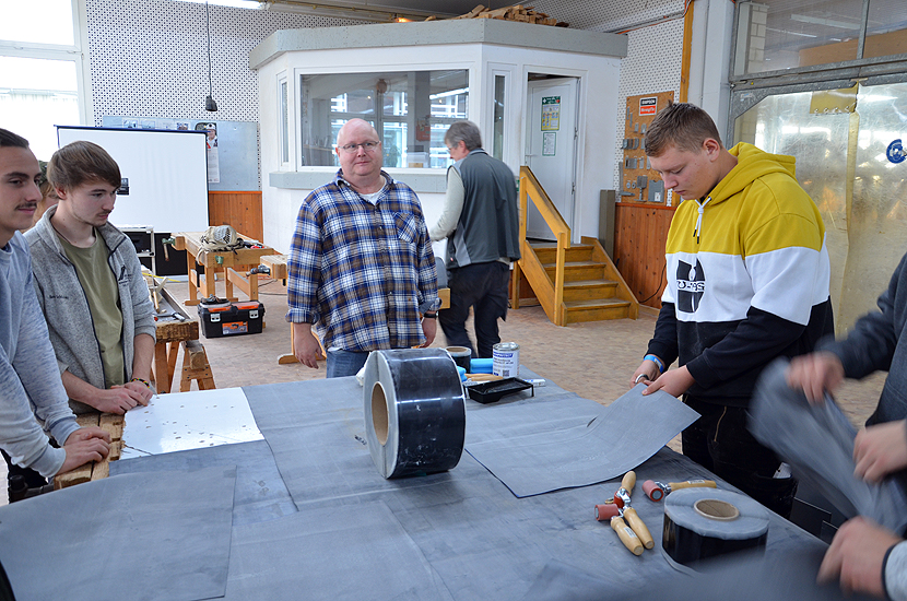 Die Firma Dachprotect stellt in einem Workshop den Azubis eine EPDM-Dachabdichtungsbahn vor, die großflächig auf Bestellung (auf Wunsch bis an die Baustelle) angeliefert wird.