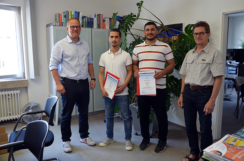Seit dem Ausbildungsjahr 2016/17 nimmt die Ausbildungszentrum AGV Bau Saar gGmbH am Programm „Berufsstart Bau“ der SOKA-Bau teil. Mit diesem Programm werden junge Menschen durch eine auf den Bau zugeschnittenen Einstiegsqualifizierung unterstützt, die trotz vieler Bemühungen keinen Ausbildungsplatz gefunden haben. Im Rahmen der Prüfung zum Fliesen-, Platten- und Mosaikleger-Gesellen haben am 17.06.2019 erstmals zwei Teilnehmer, die über Berufsstart Bau einen Ausbildungsplatz gefunden haben, die Gesellenprüfung bestanden. Kasem Husen hat im Jahr 2016/17 an Berufsstart Bau teilgenommen und seine Berufsausbildung bei der Schmelzer GmbH in Saarbrücken-Ensheim absolviert. Khaled Al-Hamdo hat im Jahr 2017/18 an Berufsstart Bau teilgenommen und seine Ausbildung in nur 2 Jahren bei der Artur Recktenwald GmbH in St. Wendel absolviert. Geschäftsführer Markus Pirron und der Betreuer von Berufsstart Bau, Georg Raesch, gratulierten beiden mit einem Weiterbildungsgutschein der AGV Bau Saar gGmbH.