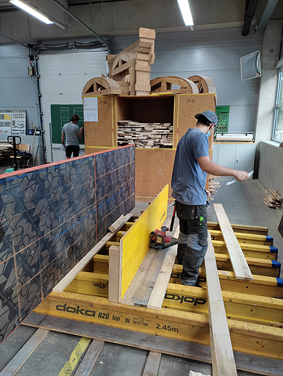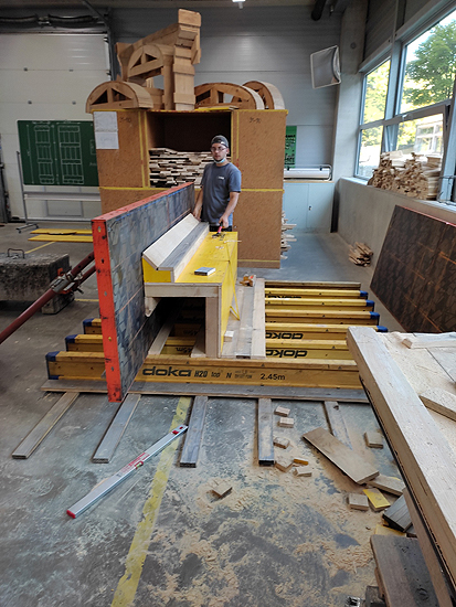Ein besonderer Schwierigkeitsgrad der Arbeit waren die Anschlüsse der schrägen Seitenwände an die Hauptwand. Hierbei entstanden besonders kniffelige Details, die der Saarländische Teilnehmer mit Bravour meisterte.