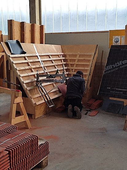 Der zweite Teil besteht aus einer Deckung mit Biberschwanzziegel in Doppeldeckung. Dazu gehört eine eingebundene Nockenkehle. Die saubere Ausarbeitung im Kehlbereich machend dieses Werkstück besonders anspruchsvoll. Beide Teile sind innerhalb von 7 Stunden zu erstellen.