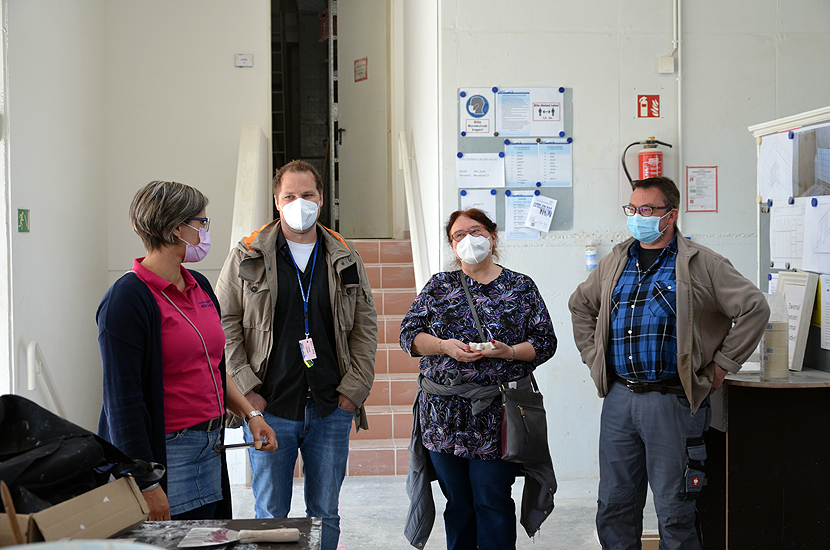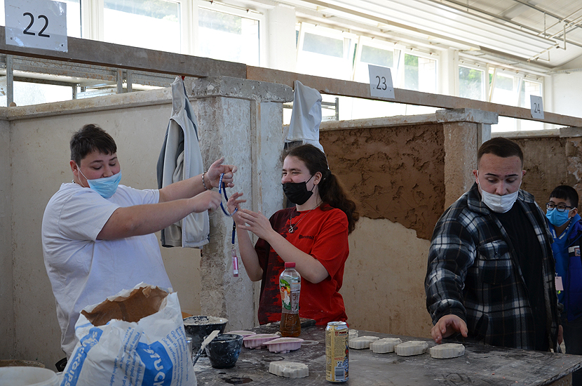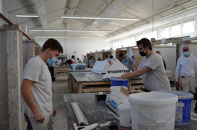 Begeistert bearbeiteten sie Schieferplatten, Fliesen, arbeiteten mit Putz und Farbe, mauerten, knackten Steine, schätzten Gewichte von Steinen, nivellierten, sägten und nagelten.