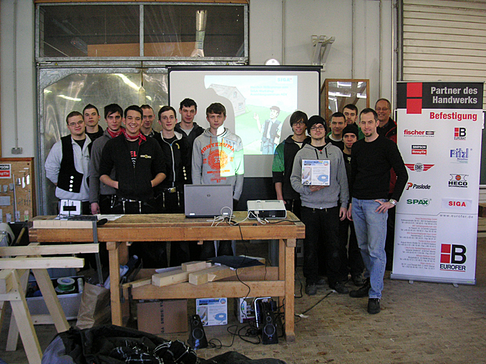 Der Schulungsleiter Herr Clemens Kraus vermittelte den Auzubildenden zum Zimmerer und zum Stuckateur im 2. Ausbildungsjahr alles Wissenswerte für die schnelle und sichere Verarbeitung der SIGA-Hochleistungs-Produkte an Hand der Verarbeitungsanleitungen für Profi-Verarbeiter.